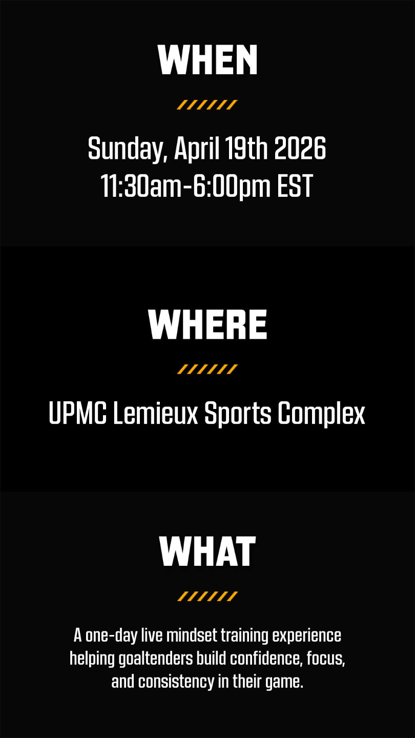 Goalie Mindset Power is a one-day, live mindset training experience designed to help goaltenders develop the confidence, focus, and consistency required to perform at their best—every game, every situation. This immersive event goes far beyond motivation or theory and delivers proven mental performance strategies used at the highest levels of hockey.